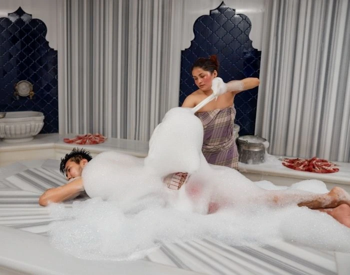 Indulge in the authentic Turkish Hammam, featuring the traditional kese & foam massage for deep cleansing and relaxation.